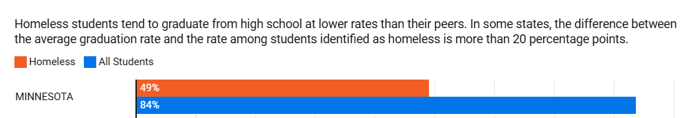 - The Center for Public Integrity (see chart below) reports that in 18 states, graduation rates for students who experienced homelessness lagged more than 20 percentage points behind the overall rate in both 2017 and 2018.